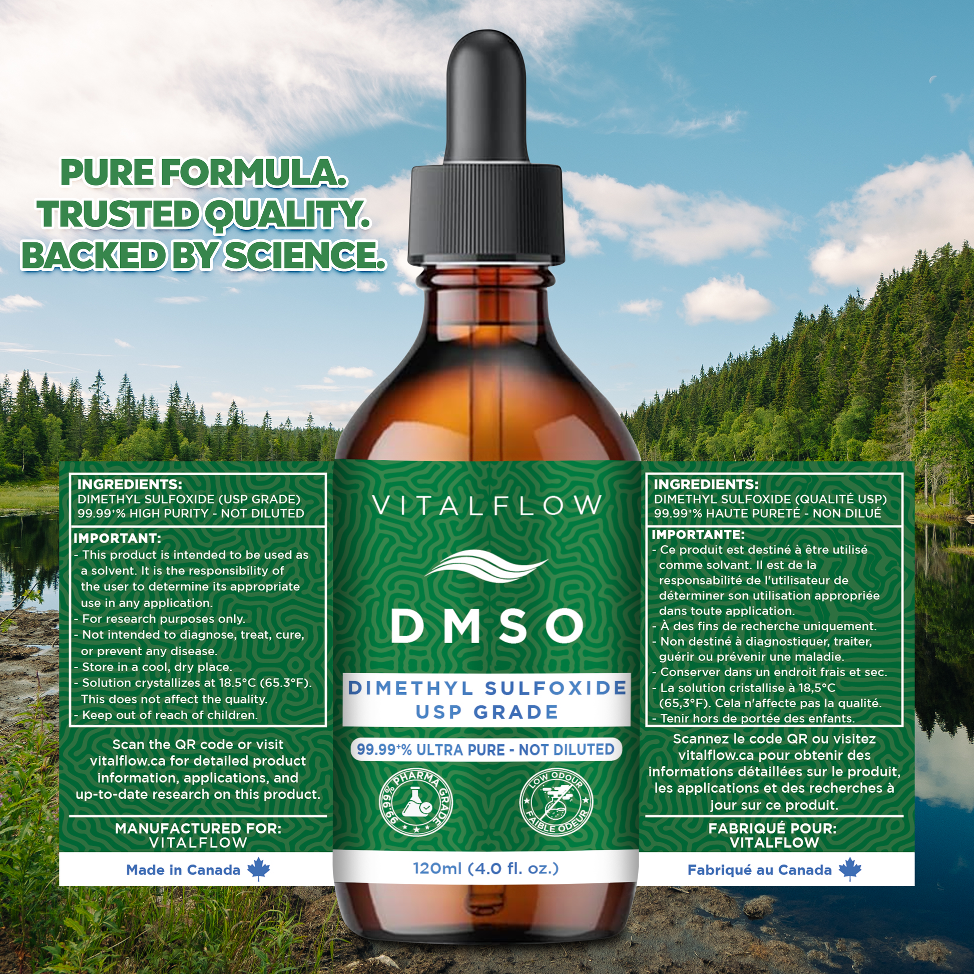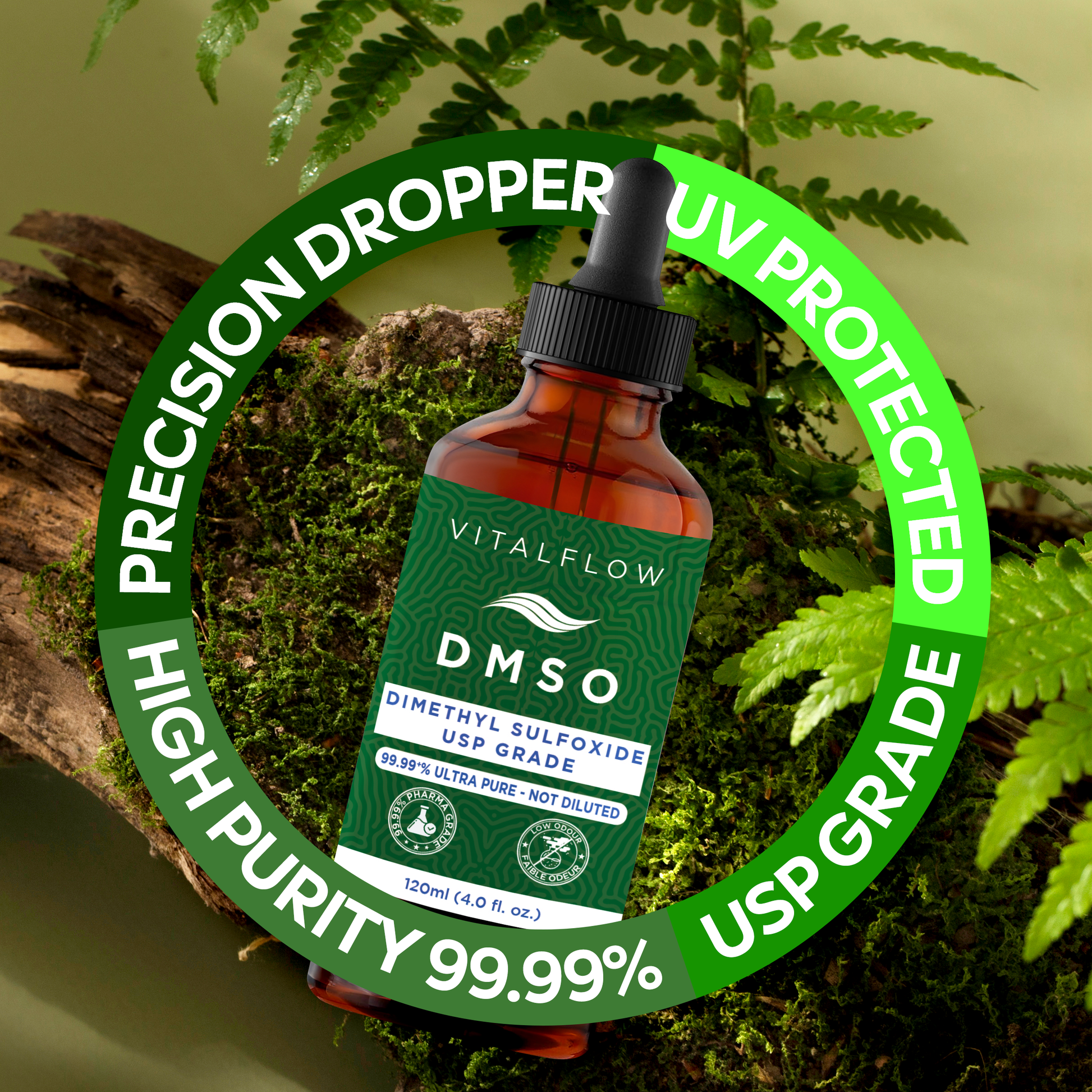 Our DMSO is guaranteed pharmaceutical-grade (USP) and certified in accordance with Ph. Eur specifications. It comes in a 120ml (4.0 fl. oz) amber glass bottle with a precision dropper for controlled application. Our DMSO undergoes a 4-stage filtration process down to a 2-micron level to ensure exceptional purity, free from harmful impurities and contaminants, such as dimethyl sulfide (DMS), formaldehyde, and heavy metals.
