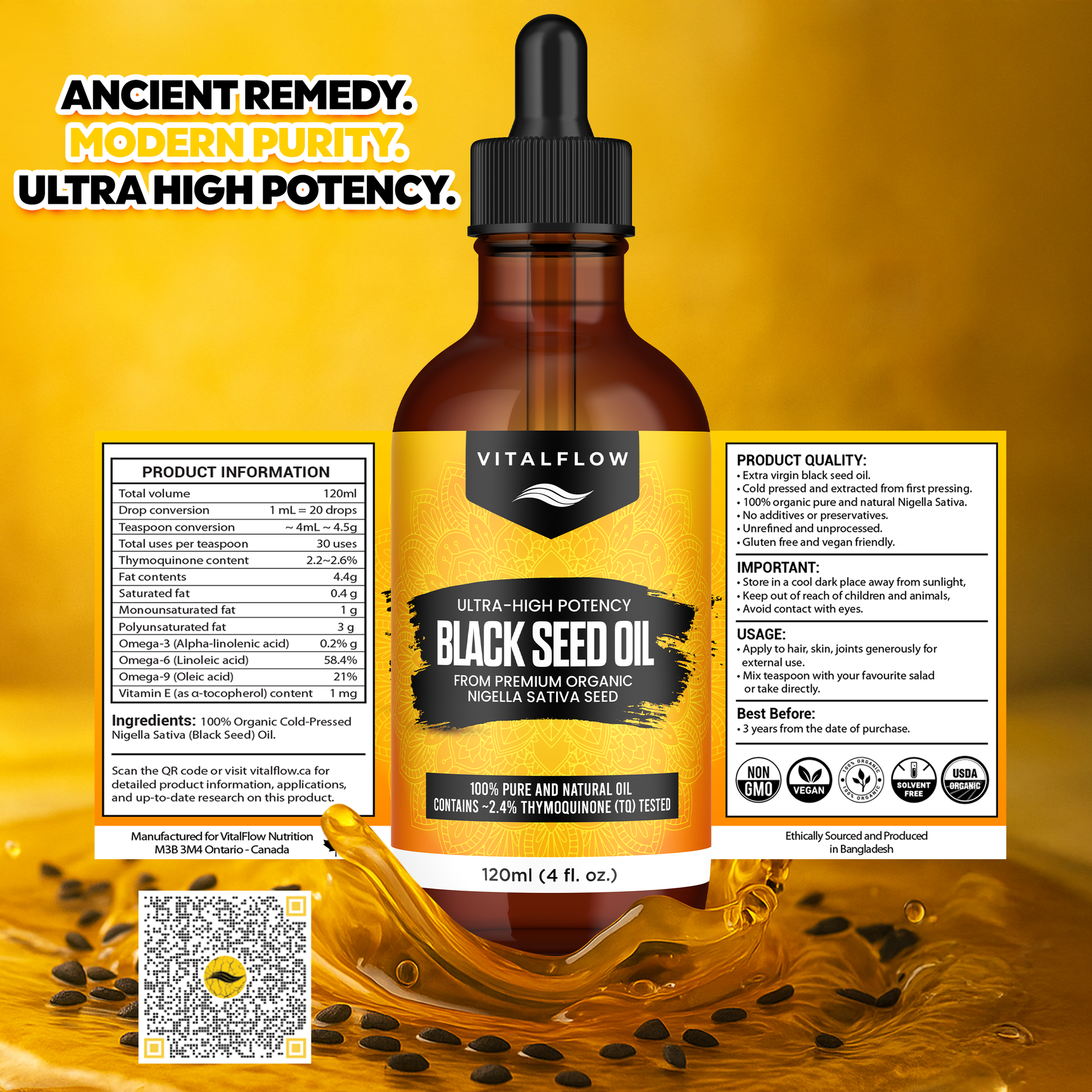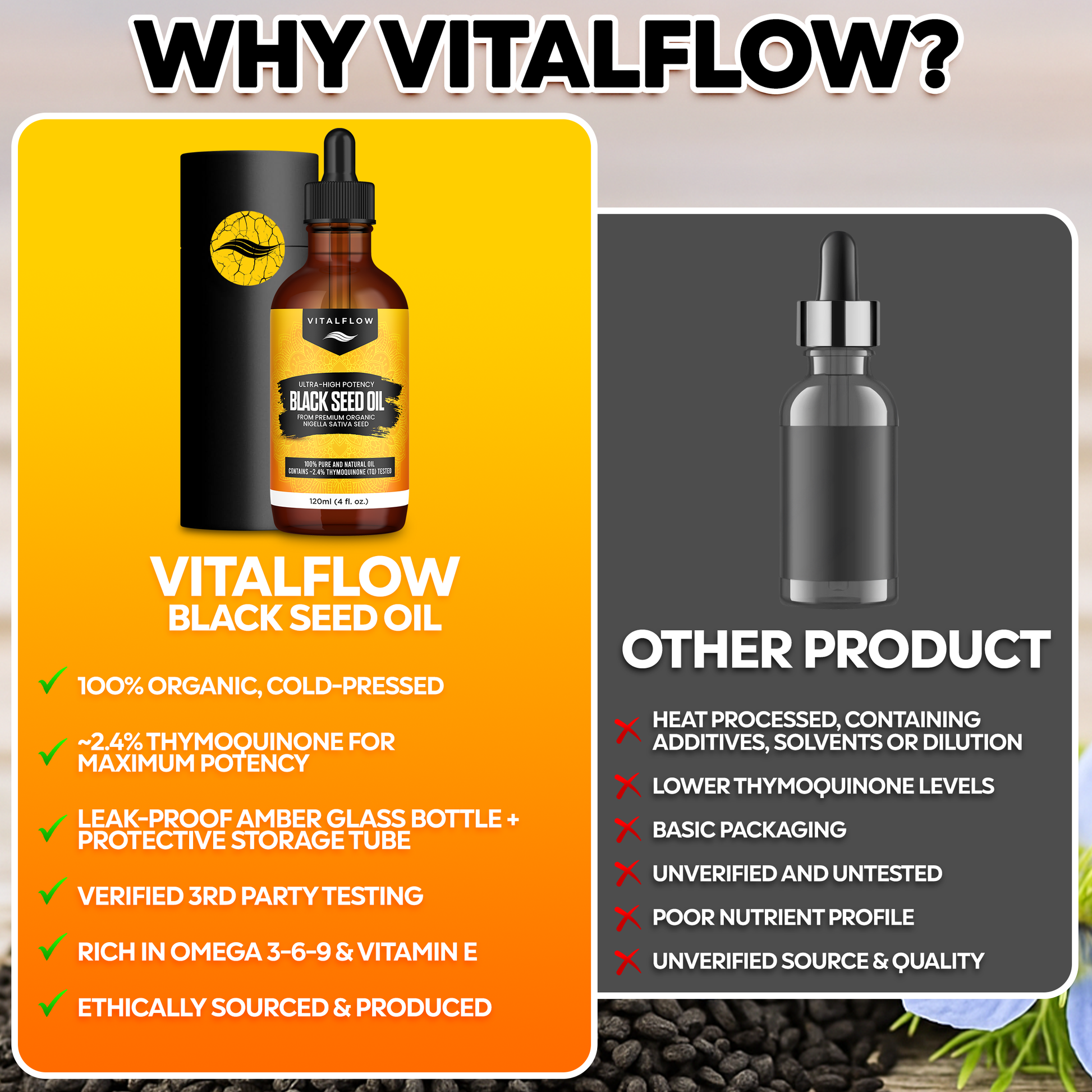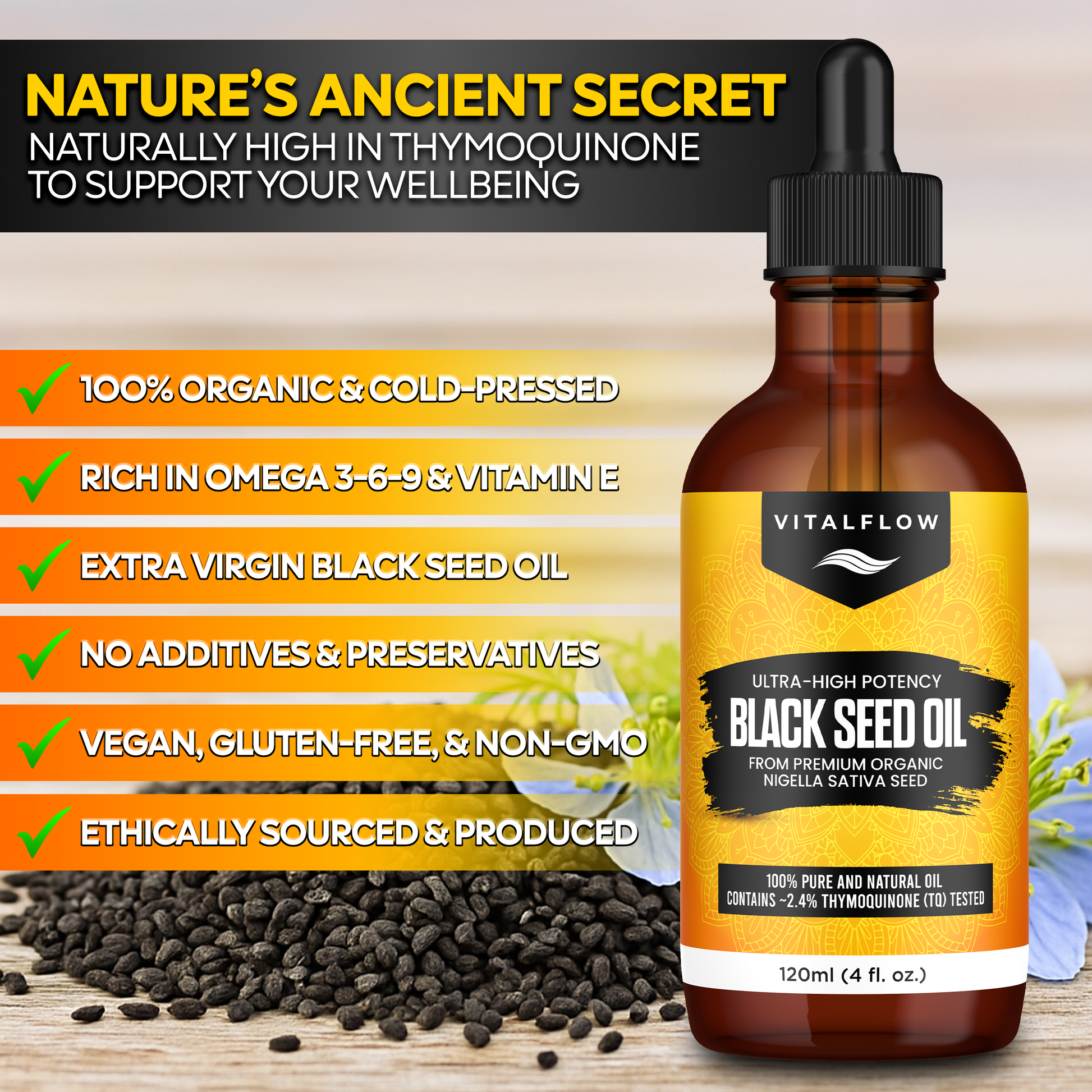 Experience the unmatched richness of VitalFlow Ultra-High Potency Black Seed Oil, sourced from the finest organically grown Nigella sativa seeds. Cold-pressed to preserve its natural profile, our oil is independently verified to contain 2.4% thymoquinone — among the highest potencies available naturally.Key Features & Benefits